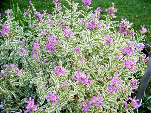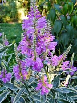 Физостегия виргинская Variegata (Вариегата). Многолетнее растение. Листья линейно-ланцетные, с широкой белой каймой, осенью становятся сиреневыми; соцветия колосовидные до 15 см длиной. Цветки розовато-сиреневые. Цветет в июле-сентябре 35-40 дней. Зимует без укрытия. Можно высаживать в сборные цветники, на берег водоема. Отлично стоит в срезке.