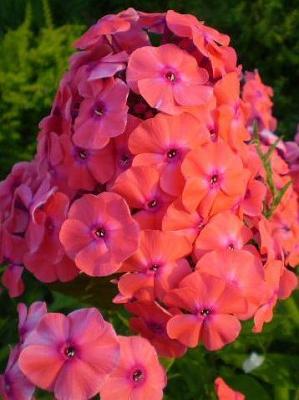 Флокс Adessa Orange (Адесса Ориндж). Невысокий компактный куст из прочных побегов. Цветки ярко-красновато-оранжевые с более темным колечком в центре. Зацветает в конце июля — начале августа. Устойчив к грибным заболеваниям.