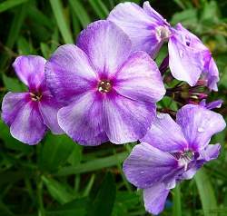 Флокс Александр Воин. По белому полю лепестков фиолетовые тени, штрихи. Половина лепестка темнее. В центре маленький фиолетовый глазок в виде звездочки. Вечером в окраске появляются синие оттенки.