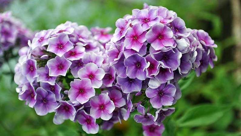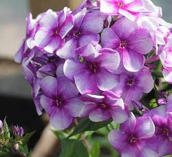 Флокс Алексей Ленский. Цветок диаметром 3,8-4,0 см, белый с сиреневым оттенком, тёмно-фиолетовым расплывающимся центром, белыми тычинками. Бутоны фиолетовые. Соцветия средние по размеру, но очень плотные, полушаровидные.