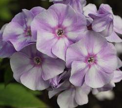 Флокс Анастасия. Бело-сиреневый с сиренево-дымчатыми тенями и маленьким бледно-сиреневым колечком. Лепестки слегка волнистые. Соцветие крупное, плотное, овально-коническое. Куст прочный, сильный, не разваливается. Победитель многих выставок. Разрастание умеренное.