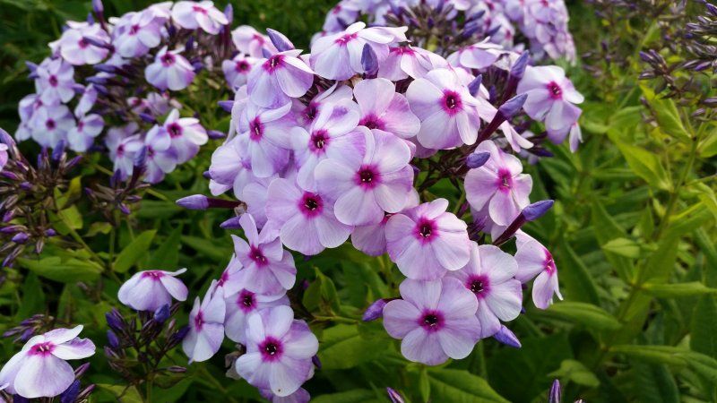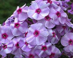 Флокс Андрейка. Светло-лилово-голубой с фиолетовым глазком. Соцветие округло-коническое, большое, пышное, средней плотности. Светло-синий в массе, цветки с чередующимися широкими полосами светло-синего и белого цвета. Куст компактный, быстро разрастается. Назначение — бордюры, срезка, групповые посадки.