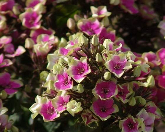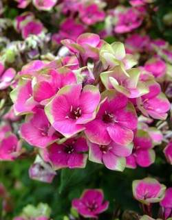 Флокс Aureole (Ауреоле). Цвет яркой фуксии с желто-зеленой окантовкой, двуцветный. Соцветие большое и очень плотное, цветки мелкие. Устойчив к мучнистой росе. Легко разрастается, жизнестойкий.