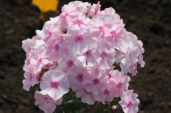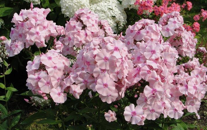 Флокс Августейшая Особа. Цветок диаметром 3,8-4,0 см, нежно-розовый с тонким ярким малиновым колечком, слегка волнистыми лепестками. Соцветие средней величины, плотное, овально-коническое, очень красивого сложения, не выгорает. Высота куста 80-90 см. Средний срок цветения. Разрастается медленно.