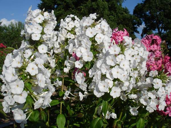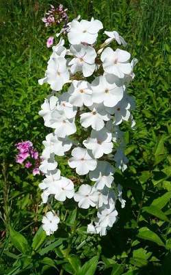 Флокс Белая Пирамида. Метельчатый сорт органично вписывается в любую садовую композицию и также радует своим цветением как одиночное растение. Прочный куст с многочисленными ярко-зелеными, узкими листьями достигает 100 см в высоту. Совершенно белые цветки среднего размера с лепестками ромбической формы и бело-кремовыми тычинками собраны в крупные , пирамидальные соцветия.