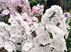 Флокс Белоснежка. Белый с розовой трубкой и розовыми точками в центре. Соцветие крупное, плотное, красиво сложенное. Стебли прочные, куст довольно раскидистый, с густой темно-зеленой листвой. Неприхотливый, хорошо разрастается.