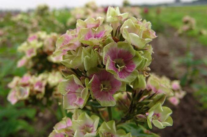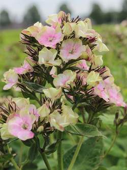 Флокс Bold and Beautiful (Болд энд Бьютифул). Цветки маленькие, розово-белые с зелёно-жёлтыми краями. Соцветия плотные. Листья тёмно-зелёные. Куст компактный, высотой 50-60 см.