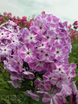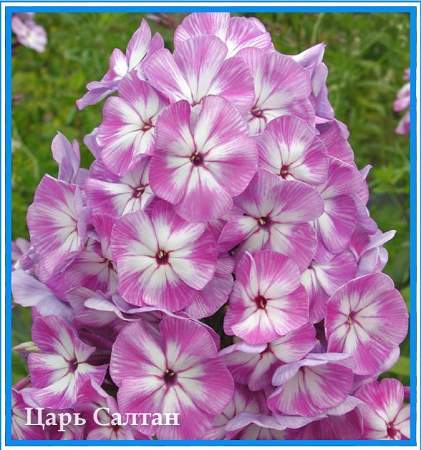 Флокс Царь Салтан. Высота 70 см, цветок 5 см. Очень крупные, оригинально окрашенные цветки — розовато-фиолетовые с крупным белым центром и белой штриховкой. Соцветия плотные, нарядные. Цветет в ранние сроки.