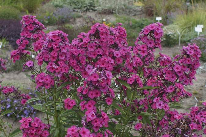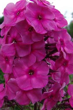 Флокс Classic Cassis (Классик Кассис). Цветок пурпурно-розовый с густым дымчатым напылением и узким малиновым глазком. Соцветие округло-вытянутое, крупное. Высота 50 см. Диаметр цветка: 1,8-2,5.
