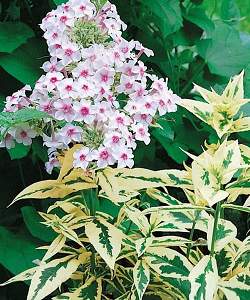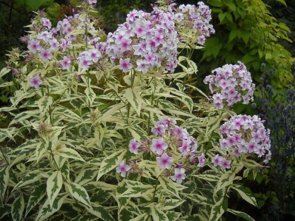 Флокс Creme de la Menthe (Крем де ла Менте). Куст высотой 70 см. Листья пёстрые, зелёные с кремовой каймой. Соцветие плотное округло-коническое. Цветки розовые с тёмно-розовым глазком.