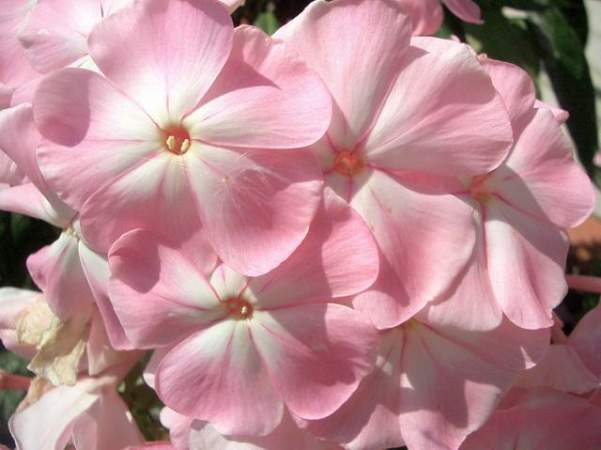 Флокс Цвет Яблони. Нежно-розовый, теплый по тону, с большим белым центром, перламутровой окраски. На солнце не выгорает. Цветок колесовидной формы, очень крупный.