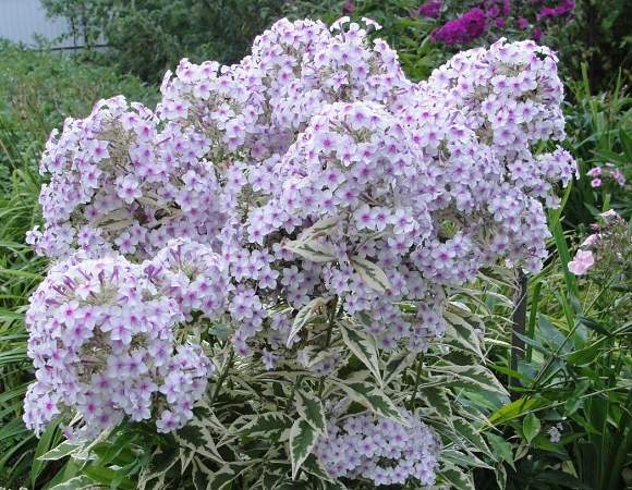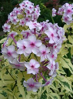 Флокс Darwin's Joyce (Дарвинс Джойс). Бело-розоватый с размытым ярким центром. Соцветие большое, очень плотное. Листья зеленые с широкой перьевидной светлой окантовкой. Куст прочный. Цветение продолжительное. Устойчивый к заболеваниям сорт.