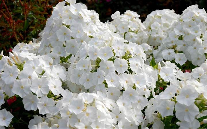 Флокс David (Давид) — самый популярный из белоснежных сортов. Куст компактный, хорошо облиствленный. Стебли прочные прямостоячие. На концах образуются огромные соцветия, которые в свою очередь состоят из больших пятилепестковых цветков белого цвета. Цветки ароматные. Листья ланцетные, удлиненные, супротивные.