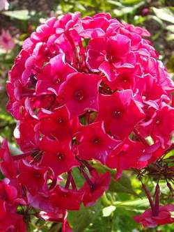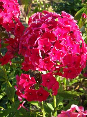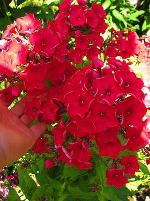 Флокс День Победы. Авторская серия "Пламенный флокс". Размер цветка 3,2 см. Высота куста до 70 см. Срок цветения средне-поздний. Редкого красного цвета с киноварным оттенком. Не выгорает совершенно. Края лепестков слегка подворачиваются. Соцветие овально-коническое, большое, сильно разветвленное, плотное. Создает красивое яркое пятно в цветнике.