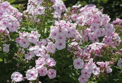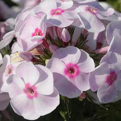 Флокс Десерт. Цветки диаметром 3,5 см, колесовидные, белые с лёгким сиреневато-розовым румянцем и таким же колечком. Лепестки сильно перекрывают друг друга. Соцветия плотные, разветвлённые. Куст компактный, прочный, высотой 60 см, среднего срока цветения.