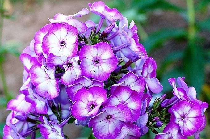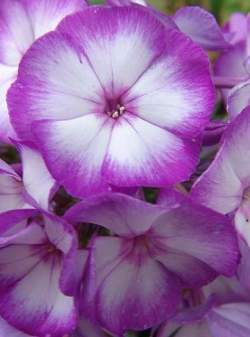 Флокс Дыхание арктики. Невысокий куст (максимум 60 см) завораживает загадочной окраской соцветий. Основная часть лепестка кристально-белая, но края обведены широкой фиолетовой каймой. Такого же цвета колечко и в середине лепестка. Сами цветки средних размеров, собраны в округлое соцветие. Распускаются в середине лета.