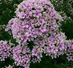Флокс Егорка. Цветки звездчатые, белые с сиреневыми тенями, со сгущением к центру и пурпурным глазком. Соцветие коническое с выступом, плотное, включает множество мелких звездчатых цветков.