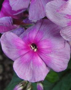 Флокс Элегия. Дымчато-сиреневый, неяркая сиреневая звезда в центре расплывается, превращаясь в маленький глазок. Соцветие овально-коническое, цветет очень обильно. Куст компактный. Очень интересный сорт.