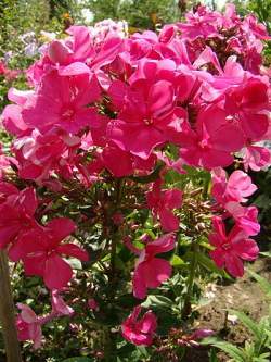 Флокс Елена. Цветки малиновой ровной окраски. Обратная сторона лепестка атласно-белая. Соцветие очень большое, плотное. Разрастается быстро. Среднего срока цветения. Цветки 3,5 см в диаметре. Высота 70 см.