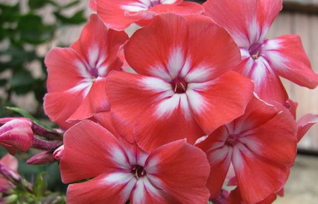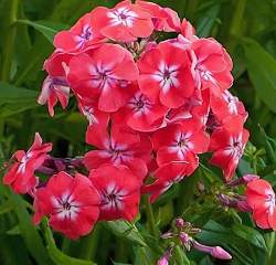 Флокс Feuerball (Фойербаль). Чисто-красный, яркий контраст с белым центром. Выделяется из всех красных чистотой тона. По мере отцветания слегка тускнеет. Соцветие крупное. Прочные толстые стебли. Цветки крупные, 4 см в диаметре. Высота 80 см. Срок цветения средний.