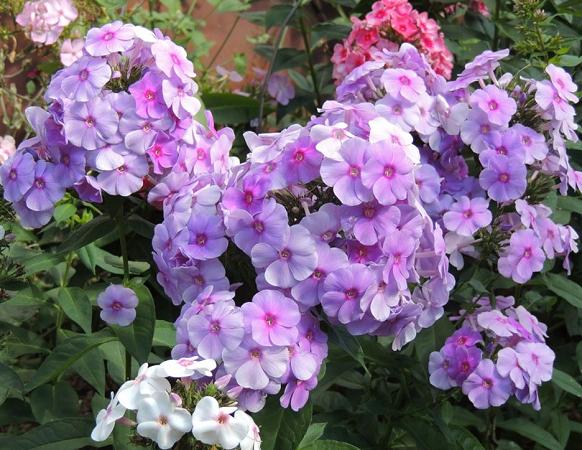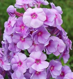 Флокс Фиона. Цветок колесовидный, светло-сиреневый с фиолетовыми тенями и пурпурным колечком. Вечером и в пасмурную погоду темнее, приобретает синие оттенки. Соцветие округло-коническое, средней плотности. Устойчивый к заболеваниям сорт. Долго и обильно цветет. Очень яркий цвет.