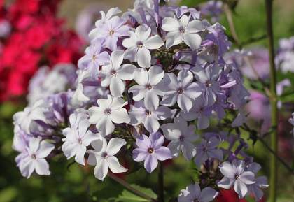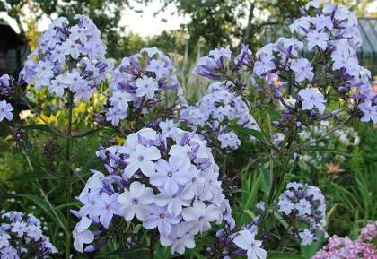 Флокс Флидеренциан. Сорт, полный очарования, и очень долго цветущий! Цветки диаметром 2-2,2 см. Высота куста 100-120 см. Цветки — сиреневато-голубые аккуратные звездочки. Соцветие крупное, овальное, слегка рыхловатое, невероятно красивое. Цветки источают нежнейший аромат, а к вечеру голубизна лепестков приобретает холодный серебристо-стальной оттенок. Листья узкие и длинные.
