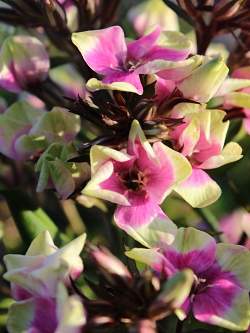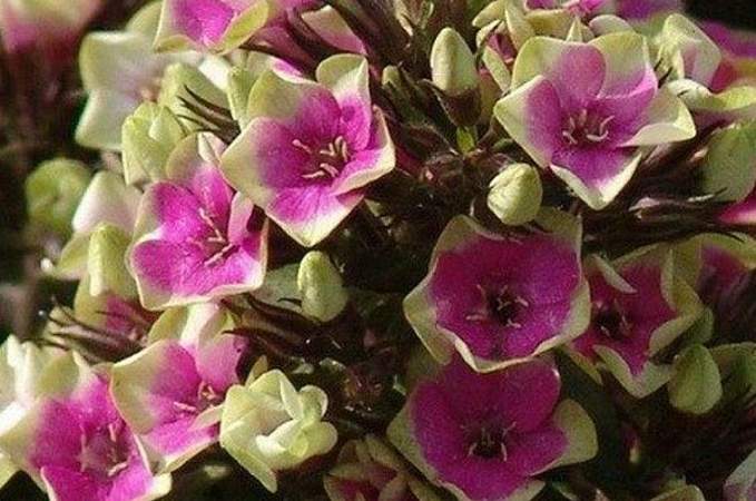 Флокс Mike's Choice (Майкс Чойс). Сорт с необычной окраской. Цветки малиновые с широким желто-зеленым волнистым краем, некрупные, диаметром 1,5-2 см. Бутоны кремовые, с темно-бордовыми прицветниками.