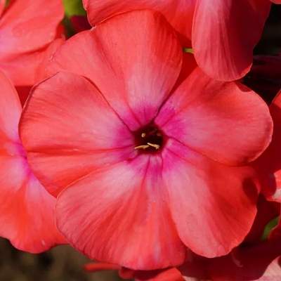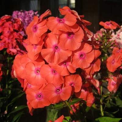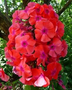 Флокс метельчатый Фобос. Цветок большой и очень большой, диаметром 4,5-5,0 см, очень яркий, красно-оранжевый с переходом в тёплый лососёво-розовый. Малиновое колечко и легкое высветление в центре. Стебли в верхней части тёмные. Куст крепкий