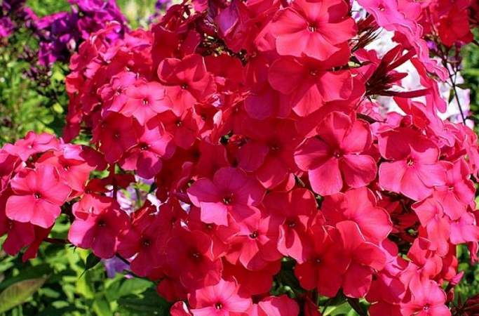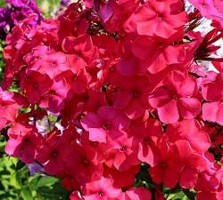 Флокс метельчатый Франт. Цветки крупные, чисто-красные, без малинового оттенка, в центре темно-красное колечко, диаметром 4 см. Соцветия крупные, ветвистые, плотные. Высота 90 см. Очень эффектный.