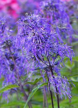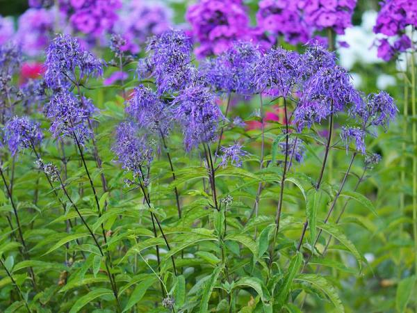 Флокс Гений. Необычный флокс. Цветки сиренево-голубые, вечером синие. Лепестки сильно рассечённые, волнистые, длиной 2,5-3 см. Соцветие состоит из 40-50 цветков и напоминает синее облачко. Цветение в июле-августе. Стебли тёмные. Высота 60-80 см.