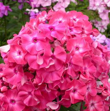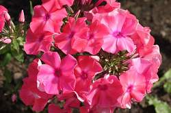 Флокс Гопак. Цветки диаметром 4,2 см, яркие, лососёво-розовые с лёгкой дымкой и волнистыми лепестками. Соцветия большие, плотные, овально-конические. Куст устойчивый, высотой до 100 см. По срокам цветения — ранний. Солнце выдерживает хорошо, почти не выгорает.