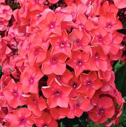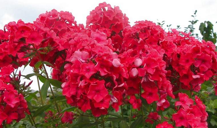 Флокс Горислав. Получил название за ярко-красные большие соцветия. Соцветия пирамидальные, крупные, плотные. Цветки со слегка закручивающимися лепестками, похожи на звезды. В центре малиновое колечко и розовые лучики. Основной тон кораллово-красный. Высота 50-60 см.