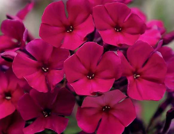 Флокс Граф Вишня. Цветки насыщенно-вишневые (бордовые) с легкой штриховкой. В центре — более темные мазки. Соцветие средней плотности. Лепестки слабо соприкасаются.