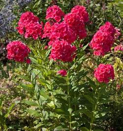 Флокс Grenadine Dream (Гренадин Дрим). Цветки сочного красно-малинового цвета, очень яркий, не выгорает, цветки диаметром 3,5 см, собраны в конусовидные соцветия, высота куста — 50-55 см. Цветение июль-сентябрь.