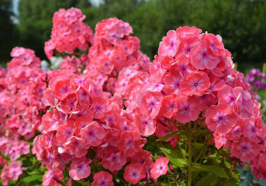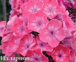 Флокс Илларион. Чудо, а не флокс — удивительный цвет, чудесное цветение! Пышные овально-конические соцветия. Цветки сложно-розовые с лучистым светло-сиреневым центром и пурпурным колечком. Толстые прочные стебли. Срок цветения средний. Диаметр цветка 4,5 см, Высота растения 90 см.