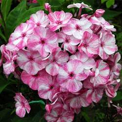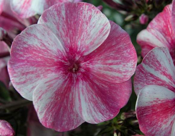 Флокс Интрига. Цветки белые с малиново-пурпурным узором из штрихов, крупные, собраны в круглое плотное соцветие. Цветет продолжительно. Высота до 95 см. Срок цветения средний.