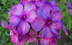 Флокс Иван Сусанин. Распускается чистого лилового (сливового) тона, затем появляется серебристая, седая штриховка, постепенно заполняя почти все поле лепестка, оставляя в центре звезду, не имеющую четких границ; вечером приобретает голубоватый оттенок.