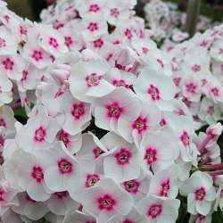 Флокс Julia (Джулия). Цветки 3,5 см, белые с малиново-пурпурным колечком и светло-пурпурными тенями по краю лепестков. Трубка фиолетовая, что делает соцветие очень нарядным. Форма колесовидная с сильно перекрывающимися лепестками. Плотное округлое соцветие, компактный куст высотой 60 см. Средне-позднего срока цветения.
