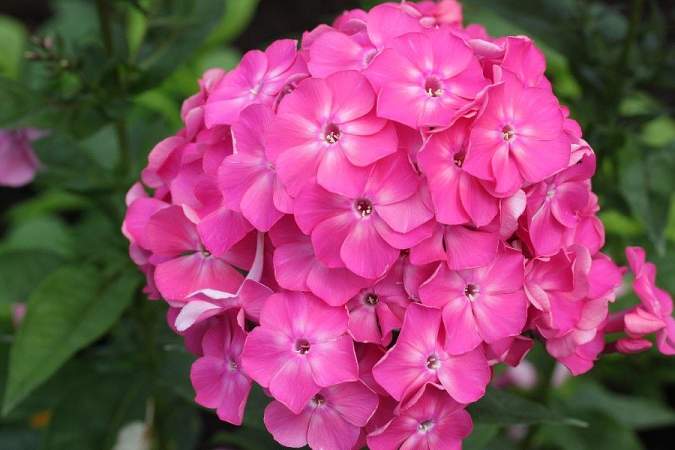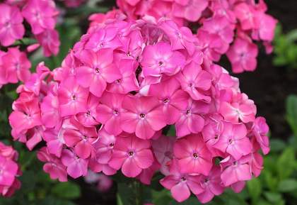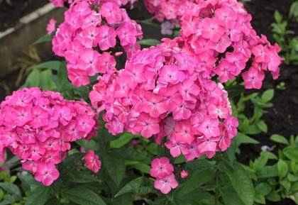 Флокс Клавдия. Цветки диаметром 4 см, ярко-розовые. Соцветия очень плотные и крупные, что очень выигрышно смотрится на компактных кустах высотой 60 см. Срок цветения среднеранний.