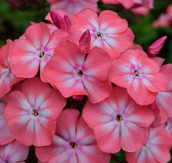 Флокс Клементина. Розово-лососевый с эффектным белым центром и пурпурным колечком. Лепестки плотно соприкасаются друг с другом. Срок цветения ранний. Соцветия овально-конической формы.