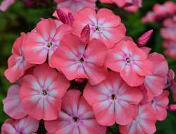 Флокс Клементина. Розово-лососевый с эффектным белым центром и пурпурным колечком. Лепестки плотно соприкасаются друг с другом. Срок цветения ранний. Соцветия овально-конической формы.