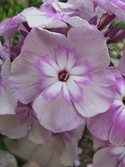Флокс Королевич Елисей. 4.5-4.8; 65-70; С. Цветок колесовидной формы, с серебристо-пепельной дымкой по розово-лавандовому фону лепестков, в центре светло-малиновая звёздочка. При вечернем освещении и в пасмурную погоду эффектно меняет розовые оттенки на сиренево-голубые. Не выгорает. Соцветие среднего размера, округло-коническое, плотное. Куст прочный, коэффициент разрастания средний. Цветение обильное и продолжительное. Назначение универсальное.