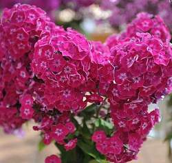 Флокс Краса России. Сорт стал победителем московской выставки в Аптекарском огороде в 2018 г. Крупные плотно сложенные соцветия, плотная фактура лепестков, насыщенный пурпурно-свекольный оттенок. В саду этот флокс заметен издалека! Цветки 4 см в диаметре. Высота куста 80 см. Срок цветения средний.