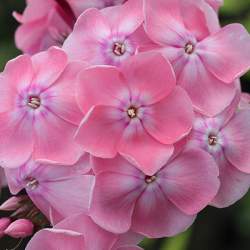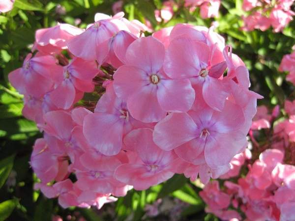 Флокс Мадам Клико. Цветки диаметром 3,5 см, лососёво-розовые с мягким палевым оттенком. Соцветия плотные, овальные. Кусты прочные, высотой 70-80 см, в подвязке не нуждаются. Средне-поздний. Общее впечатление: лёгкость и праздничность.