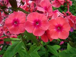 Флокс Мария Федоровна. Флокс-шедевр. Цветки очень крупные, 5 см в диаметре, темно-карминные с лососевым оттенком. Соцветие шаровидное. Высота куста 70 см. Куст прочный, пышно облиственный. Цветет в средние сроки, чрезвычайно обильно. Не выгорает.