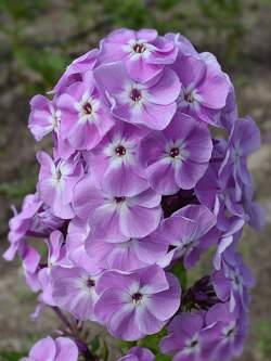 Флокс Мирослав. Светло-сиреневый с белой звездочкой. По лепесткам редкие малиновые штрихи. Соцветие очень плотное, овальное. Цветки колесовидные. Срок цветения средний. Цветок колесовидный, 3,7 см в диаметре. Высота 80-85 см.