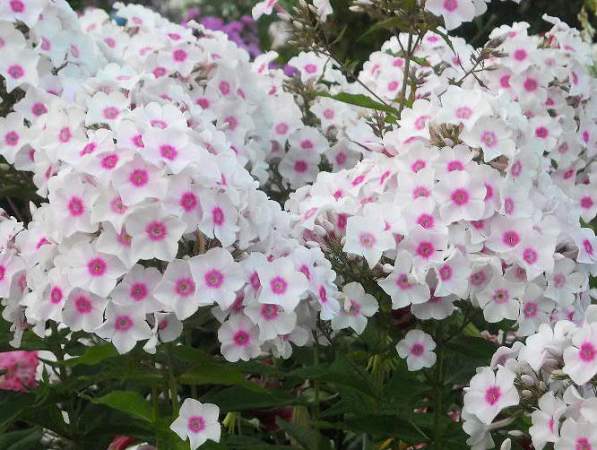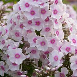 Флокс Miss Holland (Мисс Холланд). Цветок белый с очень лёгким розоватым оттенком и ярким карминным глазком. Соцветие большое, ажурное. Продолжительное цветение. Куст прочный, красивый. Высота куста 75-90 см.