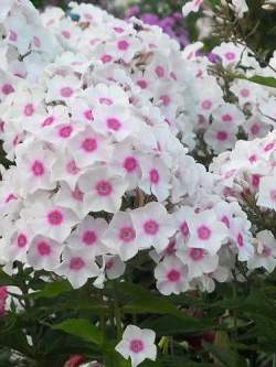Флокс Miss Holland (Мисс Холланд). Цветок белый с очень лёгким розоватым оттенком и ярким карминным глазком. Соцветие большое, ажурное. Продолжительное цветение. Куст прочный, красивый. Высота куста 75-90 см.