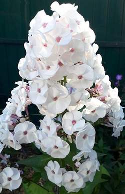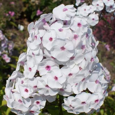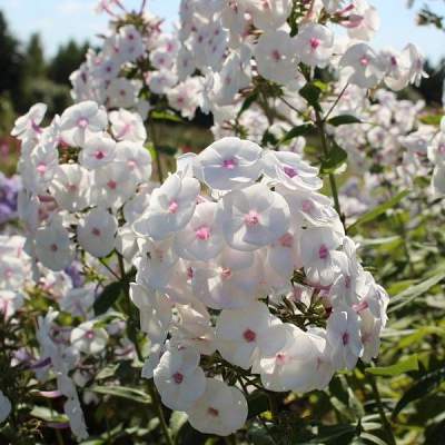 Флокс Молочное Суфле. Высота 140 см. Новый представитель серии "Суфле", в которую входят сорта со средним размером цветков (примерно 3,5 см), собранных в плотные красивые соцветия. Окраска очень свежая, цветок чисто-белый с малиновым глазком и сиреневатой трубкой. Неприхотлив, устойчив к непогоде.