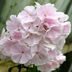 Флокс Monica Lynden Bell (Моника Линден Белл). Молочно-белый с нежно-розовым румянцем и малиновыми точками вокруг горлышка, соцветие пирамидальное, плотное и крупное, куст компактный. Высота 60 см. Цветки крупные, 4 см. Срок цветения средний.